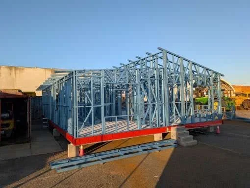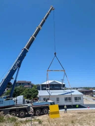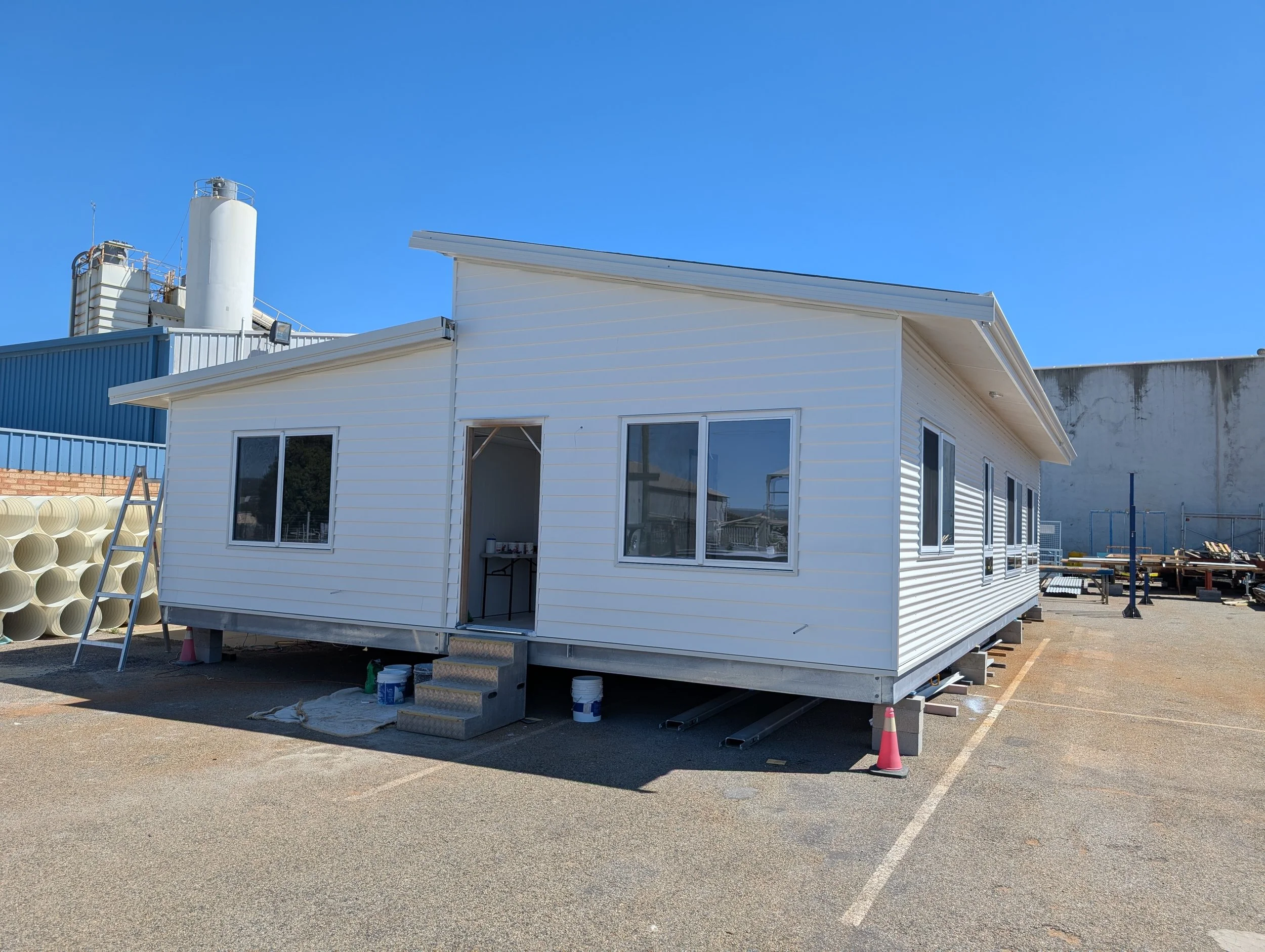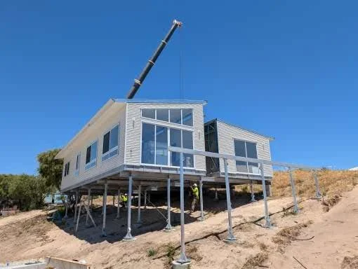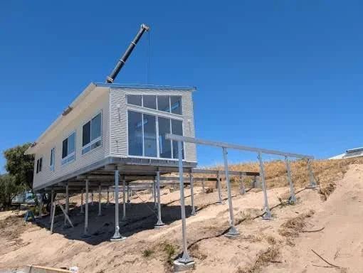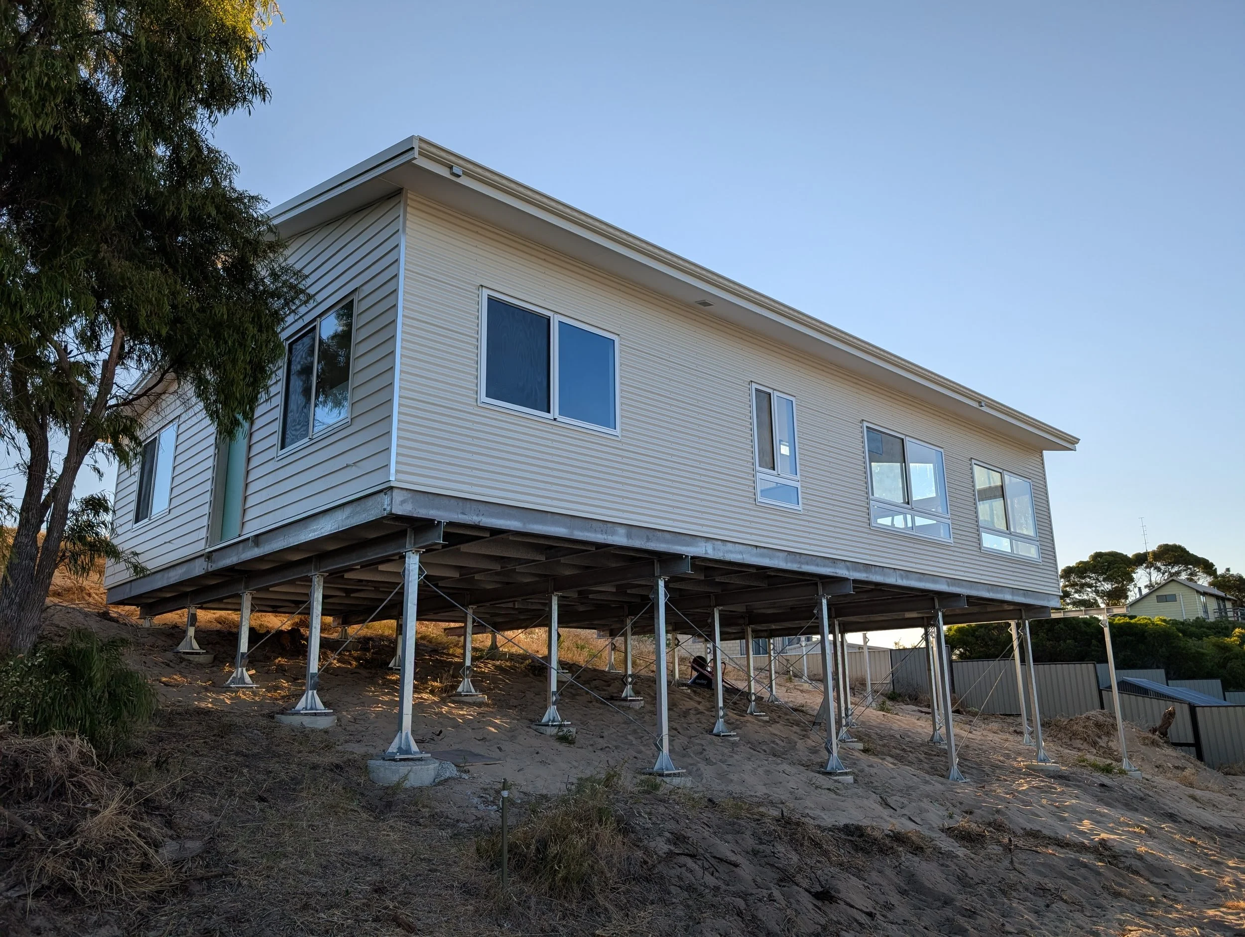Steel Base, 2 module, 3 bedroom, 2 bathroom house -Installed on sloping site, site built Alfresco & stairs